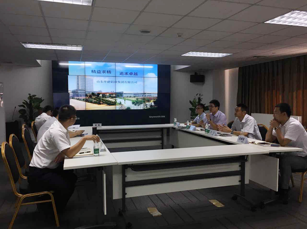 2017年8月21日,采购中心与山东华建铝业集团有限公司在信息化展示厅开展合作交流会议,采购中心财务负责人万尧、价格管理部经理任子丰出席并接待山东华建铝业集团有限公司总裁助理左文一行。