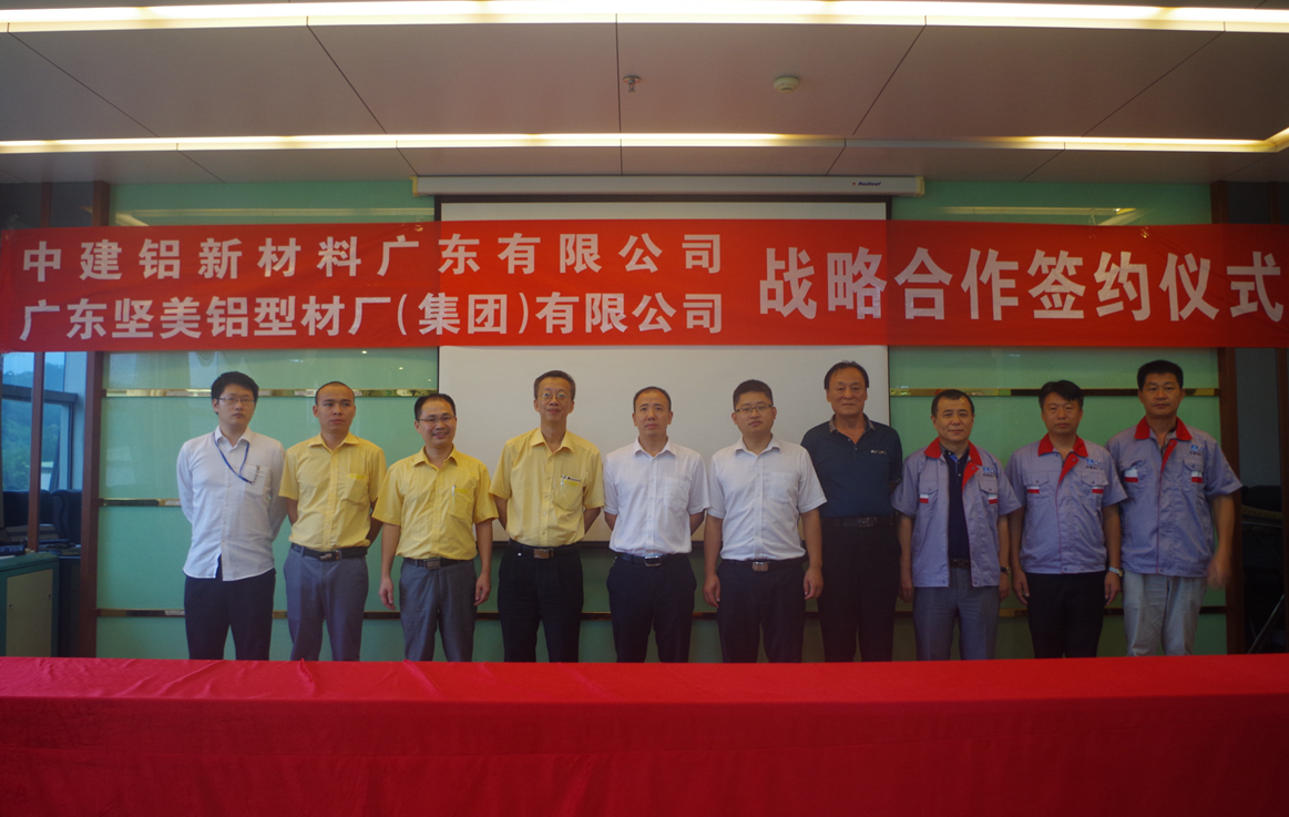 2018年8月17日,广东坚美铝型材厂(集团)有限公司(以下简称坚美集团)总经理助理赖剑,携旗下销售部总监廖端标、工业材高级顾问、研发部总监韩刚等莅临中建铝新材料广东有限公司,签署战略合作协议,加强坚实合作平台,促进企业双方共同发展、共同进步。