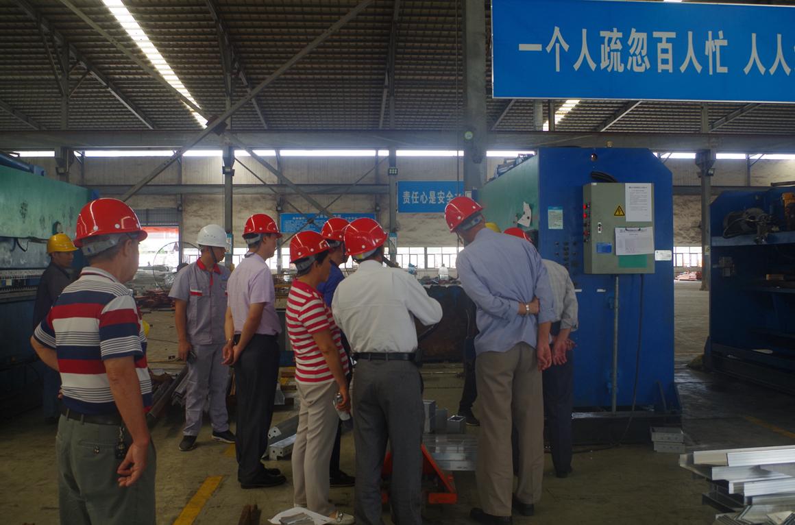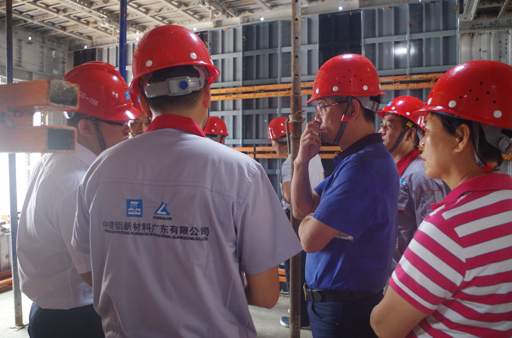 我司领导班子陪同一行人到预拼装区、生产加工区、旧模处理区、堆码区等一线车间进行参观,并由公司生产部和项管部负责人全方位讲解车间布局配置、工艺流程、安装作业流程等,将铝模公司的亮点特色一一介绍。